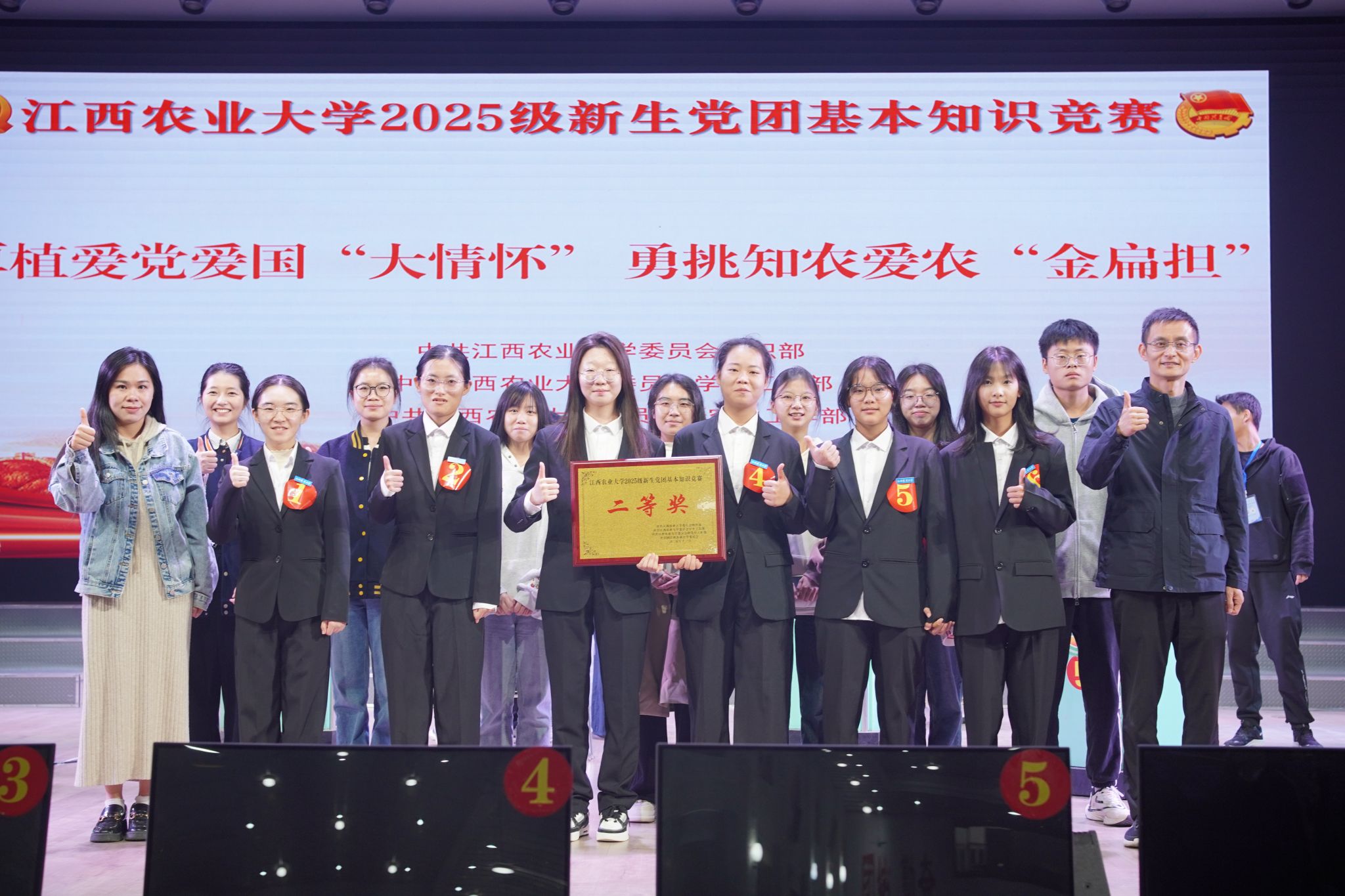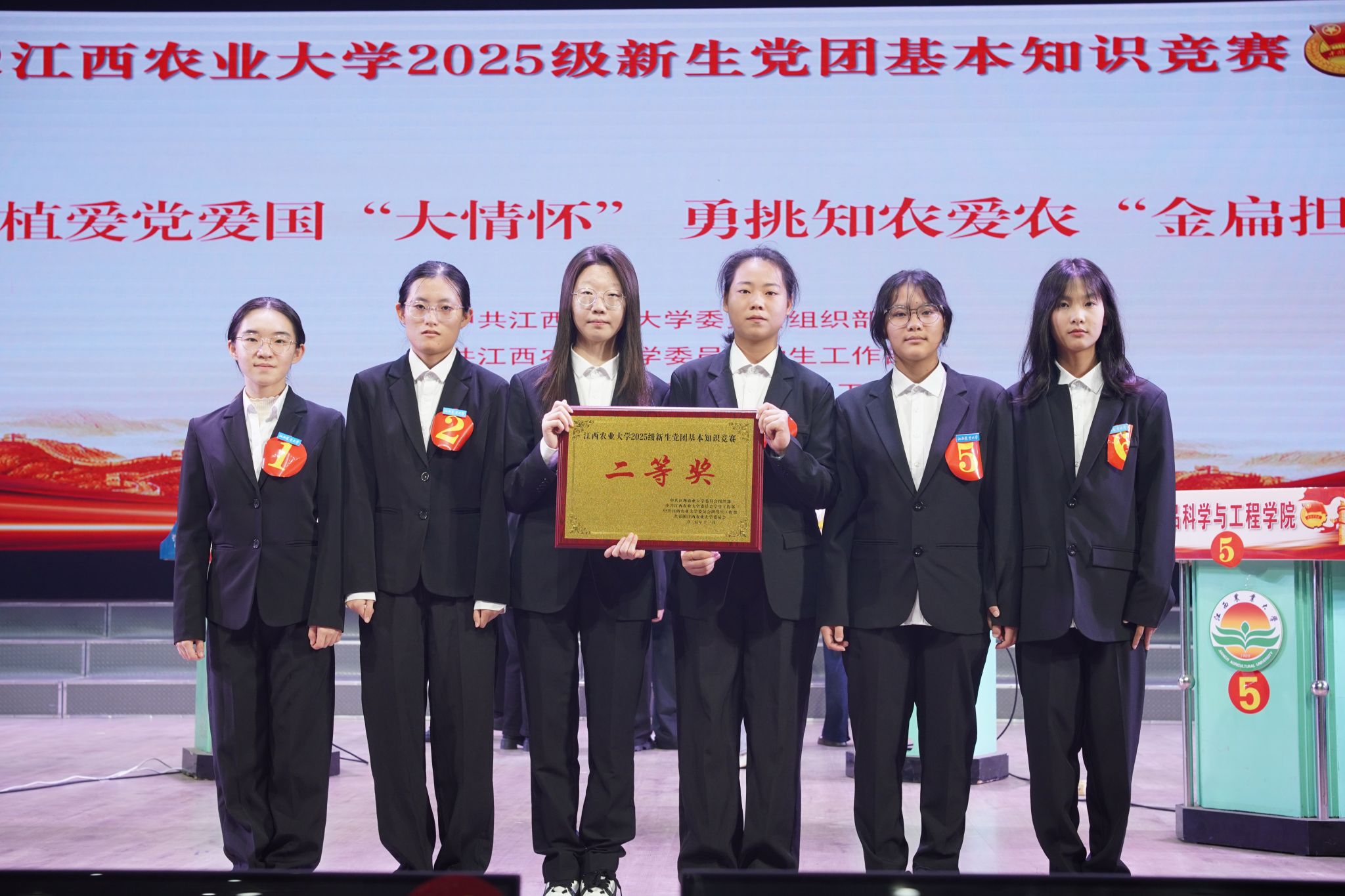 11月11日,世界足球官网2025级新生党团基本知识竞赛决赛在校大礼堂隆重举行,食品院6名2025级员工(许晶晶、李曾玥、吴沛玲、黄惠敏、郭钰妍、林怡)代表学院参赛。她们一路过关斩将,最终以第2名的优异成绩斩获二等奖殊荣!