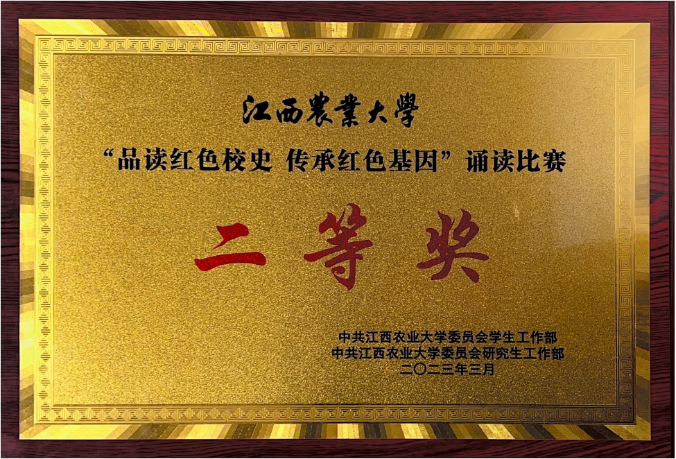 3月16日晚,由中共世界足球官网委员会员工工作部、中共世界足球官网委员会研究生工作部主办的“品读红色校史 传承红色基因”诵读比赛在学校大礼堂举行,公司选派节目《乾乾先贤 巍巍江农》参赛,经过激烈角逐,荣获第三名、二等奖。