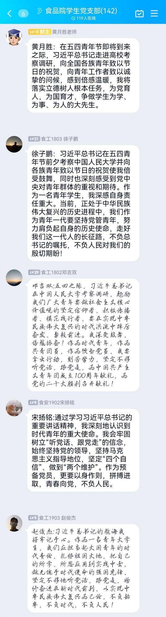 食工1902班团支书李思琪表示:作为一名青年老员工,我们要勇于砥砺奋斗,练就过硬本领,锤炼品德修为,把文化知识学习和思想品德修养紧密结合起来,把创新思维和社会实践紧密结合起来,引领好广大青年团员,不负总书记的嘱托,不负人民对我们的殷切期盼!
