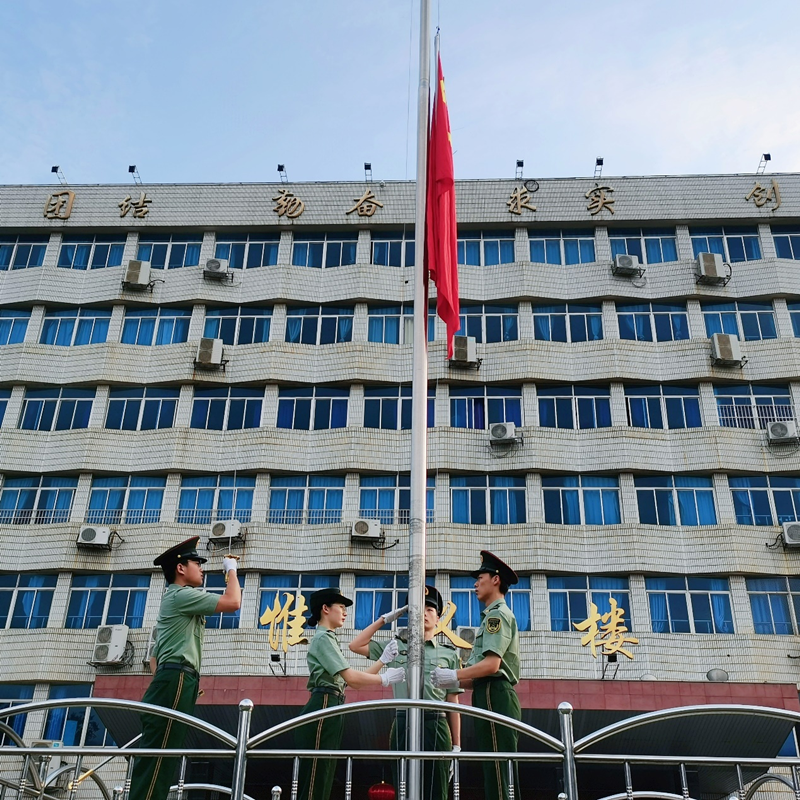 7时,国旗仪仗队护送五星红旗,步伐铿锵走向升旗台。伴随着激昂雄壮的国歌声,鲜艳的五星红旗迎风飘扬。全体师生代表肃立注目,表达出对祖国无限的热爱与崇高的敬意。
