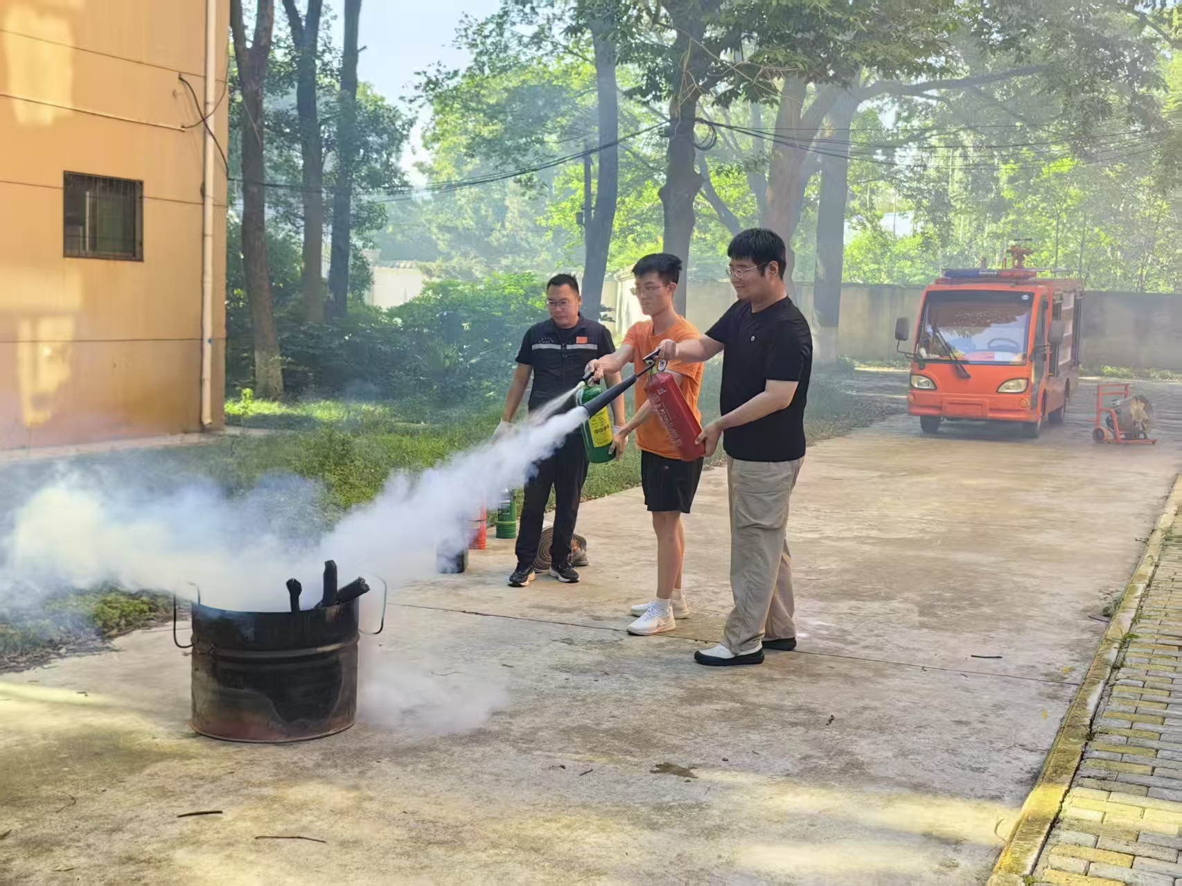 警示教育结束后,保卫处消防专员结合短片内容,进行现场延伸讲解,细致分析校园不同场景下的火灾预防要点,并示范灭火器、消防栓等消防器材的使用方法。随后,模拟火灾警报声骤然响起,在现场引导员的指挥下,师生们用湿毛巾捂住口鼻,弯腰低姿,按照预定疏散路线,快速、有序地撤离至操场安全区域。整个疏散过程紧张有序,充分展现了师生良好的应急反应能力。在实操环节,师生们踊跃参与灭火器灭火演练。大家在专业人员的指导下,运用警示教育所学知识,严格遵循“提、拔、握、压”的操作要领,成功扑灭模拟火源,切实掌握了灭火器的使用技巧。