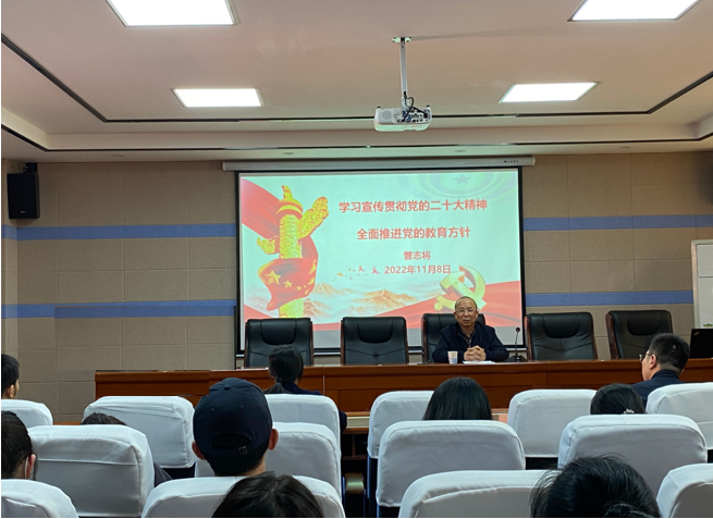 11月8日下午,公司党委委员、副董事长曾志将到学院宣讲党的二十大精神,师生党员90余人参加宣讲会,会议由公司党委书记王兰主持。