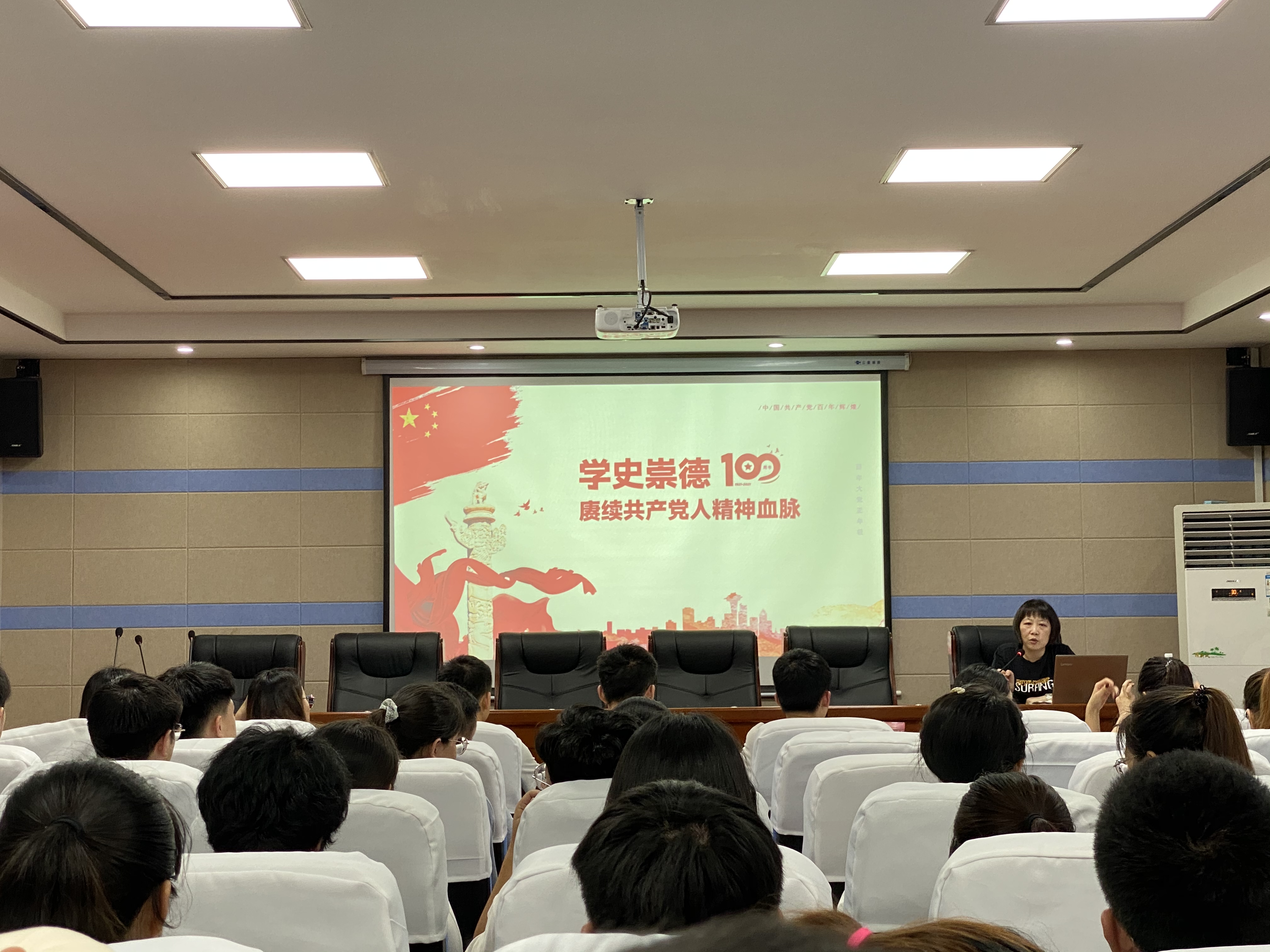公司党委副书记胡丹以“学史崇德-赓续共产党人精神血脉”为题面向公司党员代表、员工骨干、各班级员工代表上党课,用陈独秀、李大钊、邓稼先、孔繁森、陈微等一大批优秀共产党人的先进事迹,把“新民主主义革命时期历史”、“社会主义革命和建设时期历史”、“改革开放新时期历史”、“党的十八大以来的历史”生动地串连起来,引导学院员工学史明理、学史增信、学史崇德、学史力行。