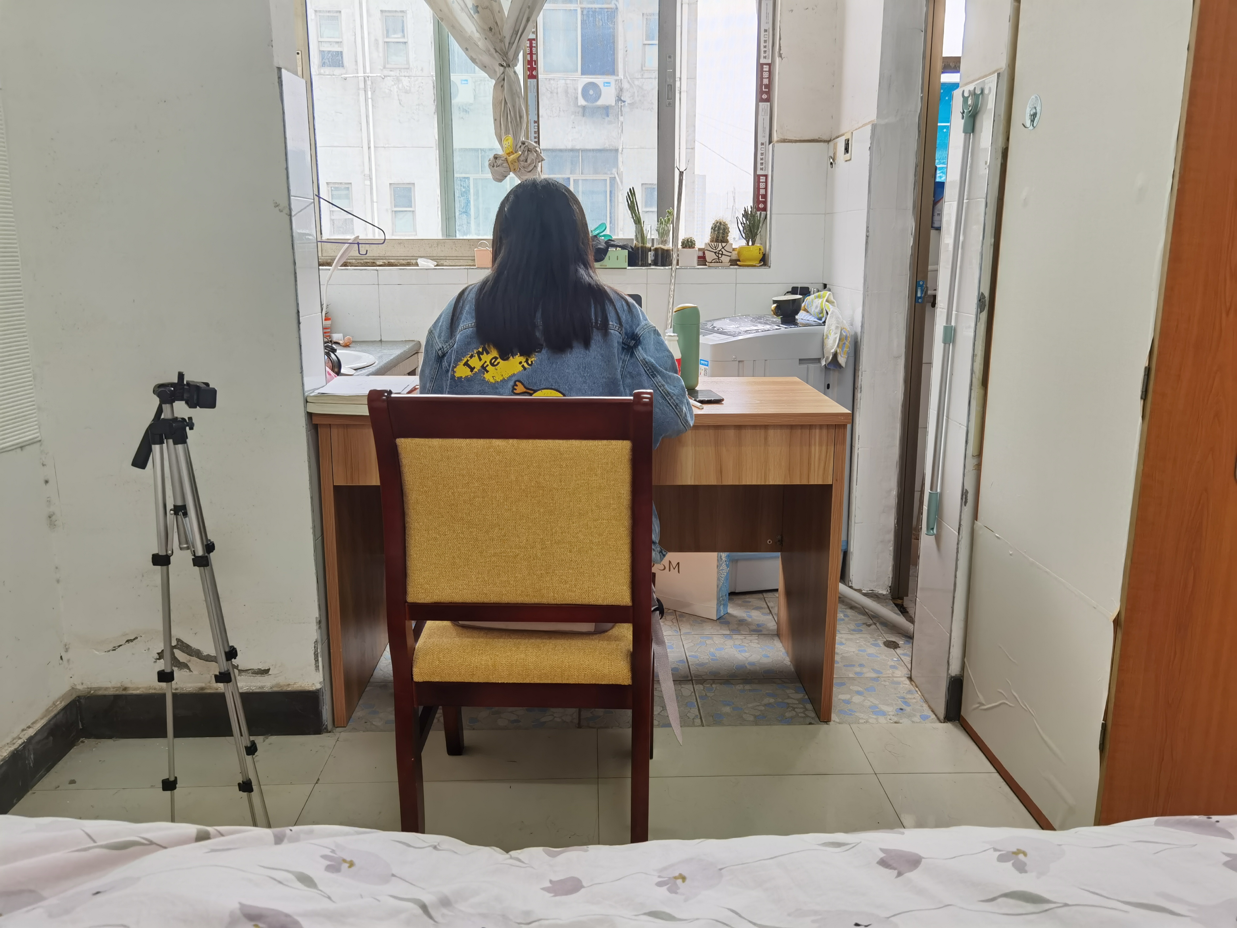 图:学院建档立卡毕业生在辅导员寝室工作站调试复试设备