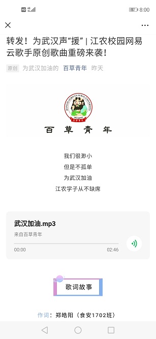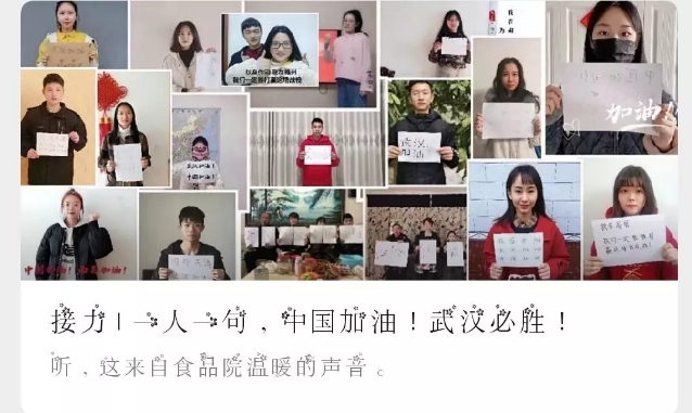 公司员工骨干以“一人一句线上接力”图文并茂的方式在院团学官方微信平台为武汉加油,传递着积极乐观的精神和必胜的信念,营造了团结奋进防控疫情的浓厚氛围。食安1702班郑皓阳同学录制原创说唱歌曲《武汉加油》“声援”武汉,向抗疫一线的“战士”致敬,得到校团委官方微信平台“百草青年”推送,发布仅1天时间阅读量就近3千。学院院友、上海巨匠咖啡食品有限公司总经理王君为抗疫一线医护人员捐赠大批咖啡等物资,以实际行动奉献爱心、勇担社会责任。