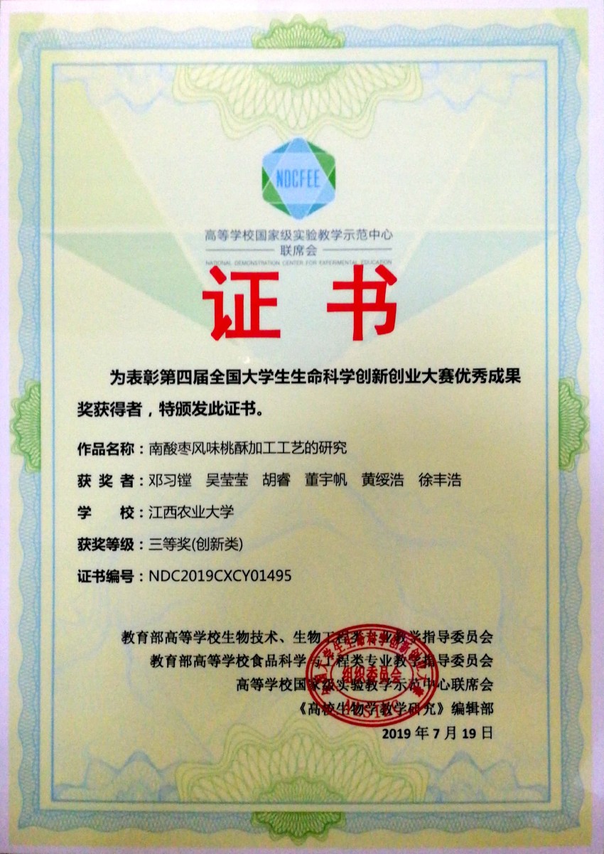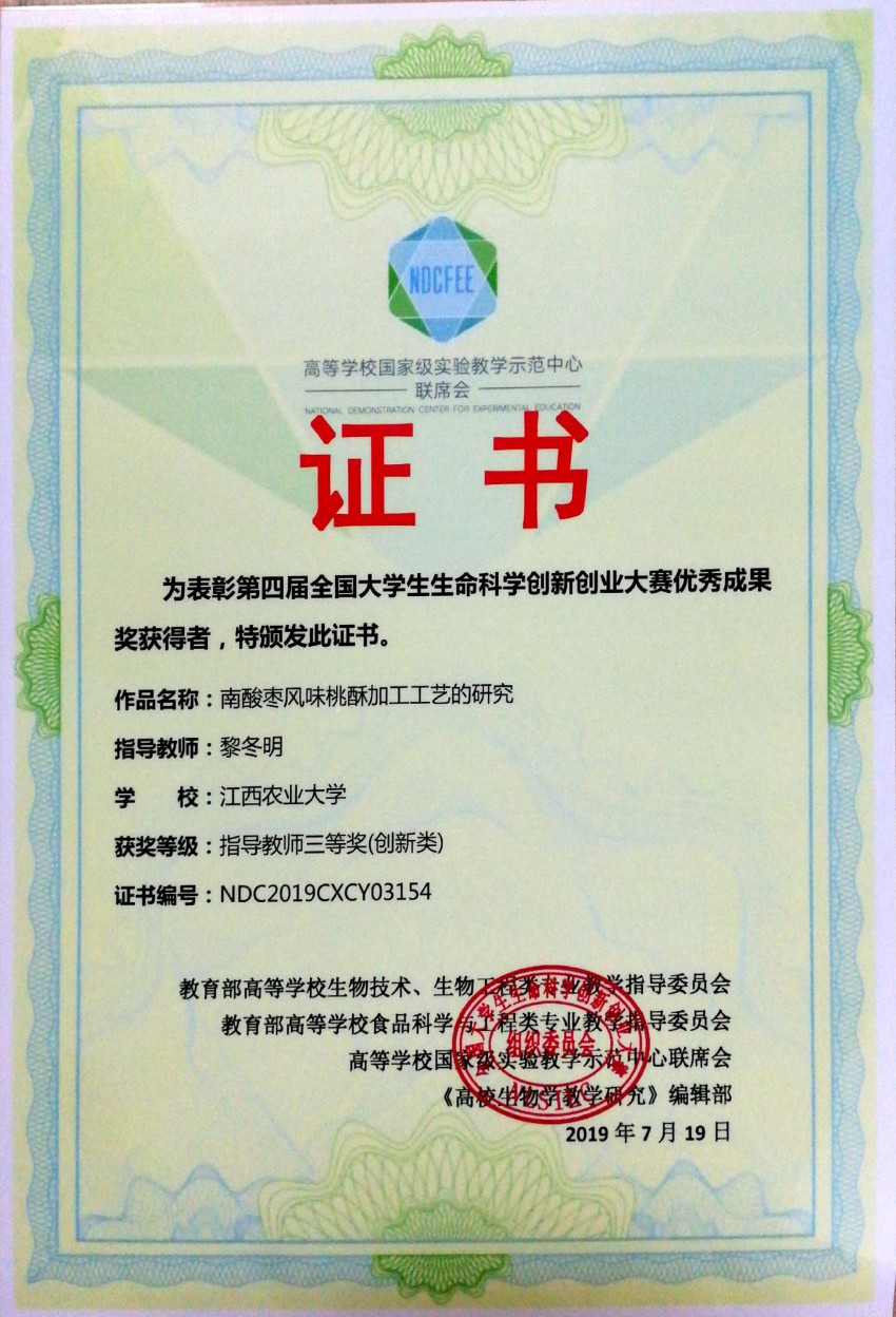 该赛事自1月份启动以来,公司高度重视,精心组织专业教师和员工积极准备作品并参赛。在参赛师生共同努力下,公司黎冬明老师指导邓习镗、吴莹莹、胡睿、董宇帆、黄绥浩、徐丰浩等同学完成的作品《南酸枣风味桃酥加工工艺的研究》获创新类三等奖。