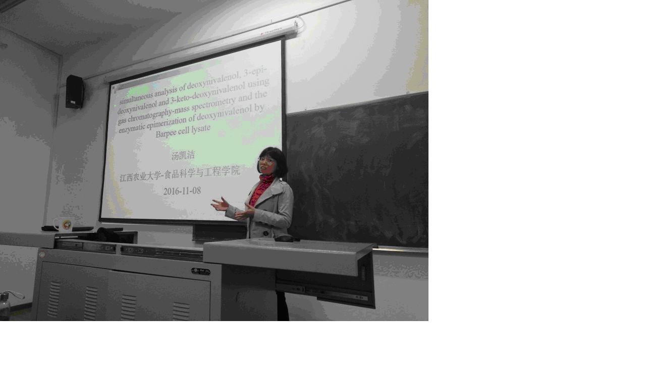 汤凯洁老师于2015.08-2016.08在加拿大农业部圭尔夫食品研究与开发中心(Guelph Research and Development Centre, Agriculture and Agri-Food Canada)进行了为期一年的博士后研究,主要从事真菌毒素检测与降解领域的研究。在本次报告会中,汤凯洁老师重点介绍了真菌毒素脱氧雪腐镰刀菌烯醇(deoxynivaleno,DON)(又名呕吐毒素,Vomitoxin)在农副产品中的污染与危害现状、DON及其代谢物 (3-epi-脱氧雪腐镰刀菌烯醇)和 (3-keto-脱氧雪腐镰刀菌烯醇)的气象色谱-质谱联用检测方法的建立以及利用微生物分泌的异构化酶降解DON的特性等三方面研究内容。据报道,随着全球气候变化,DON毒素已成为目前危害人畜安全的重大挑战之一。汤凯洁老师的报告为公司在真菌毒素研究方面开拓了新的研究思路和检测方法。